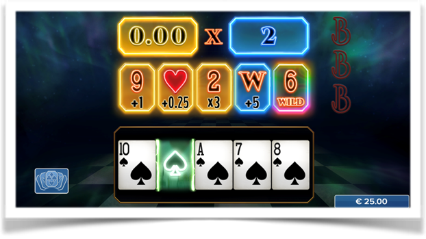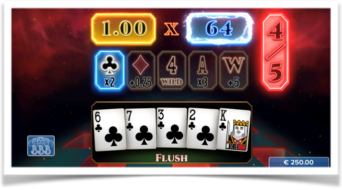 當五張撲克牌達成贏分牌型後,會由左至右依序觸發上方符合條件的特殊獎勵,並累加至金色和藍色框中。